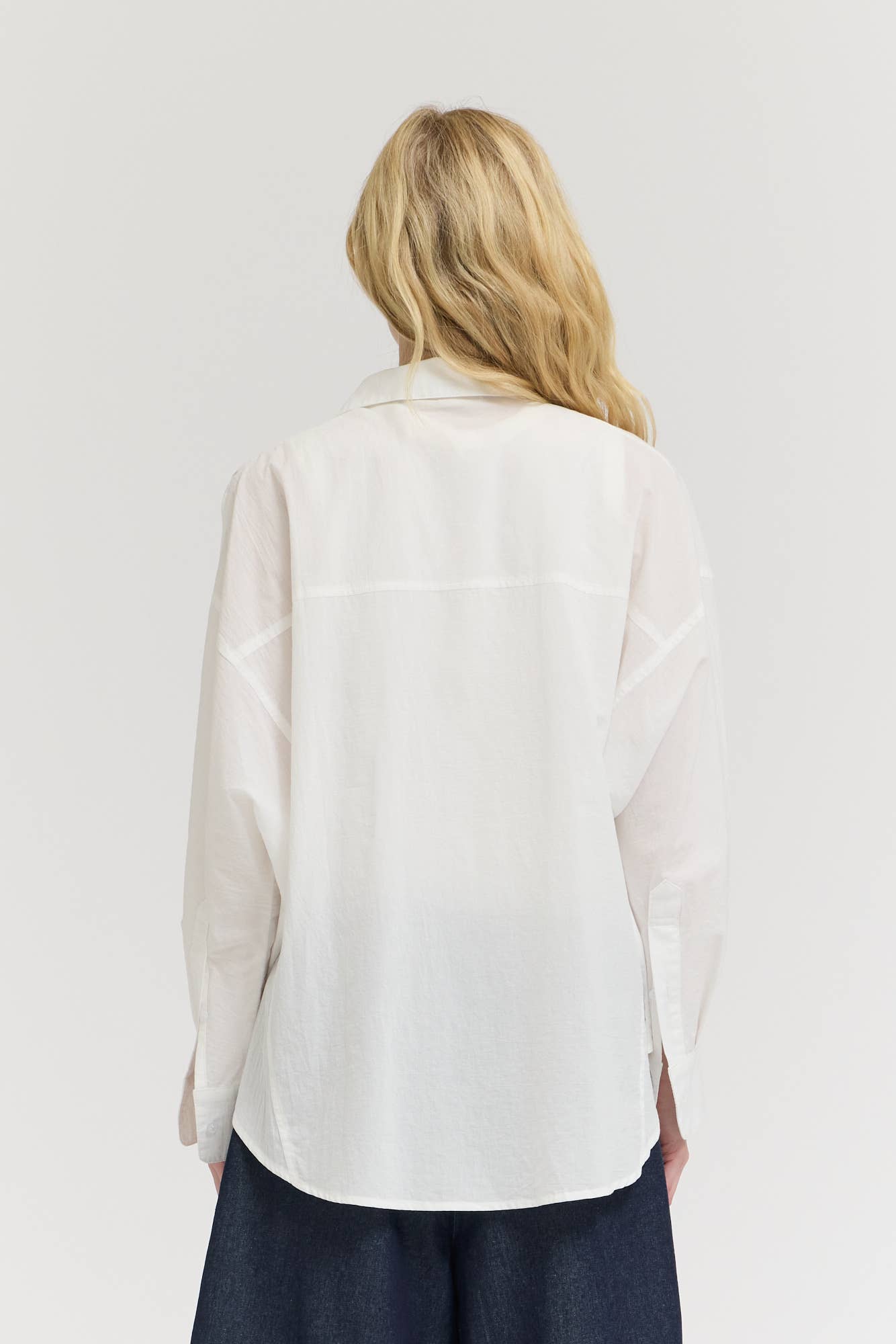 A lightweight cotton button up designed with a relaxed silhouette and subtle texture. The semi sheer crinkled fabric gives it an airy feel while the drawstring hem adds shape. Longer in the back with a shorter front hem, it layers easily while maintaining a clean, modern look.