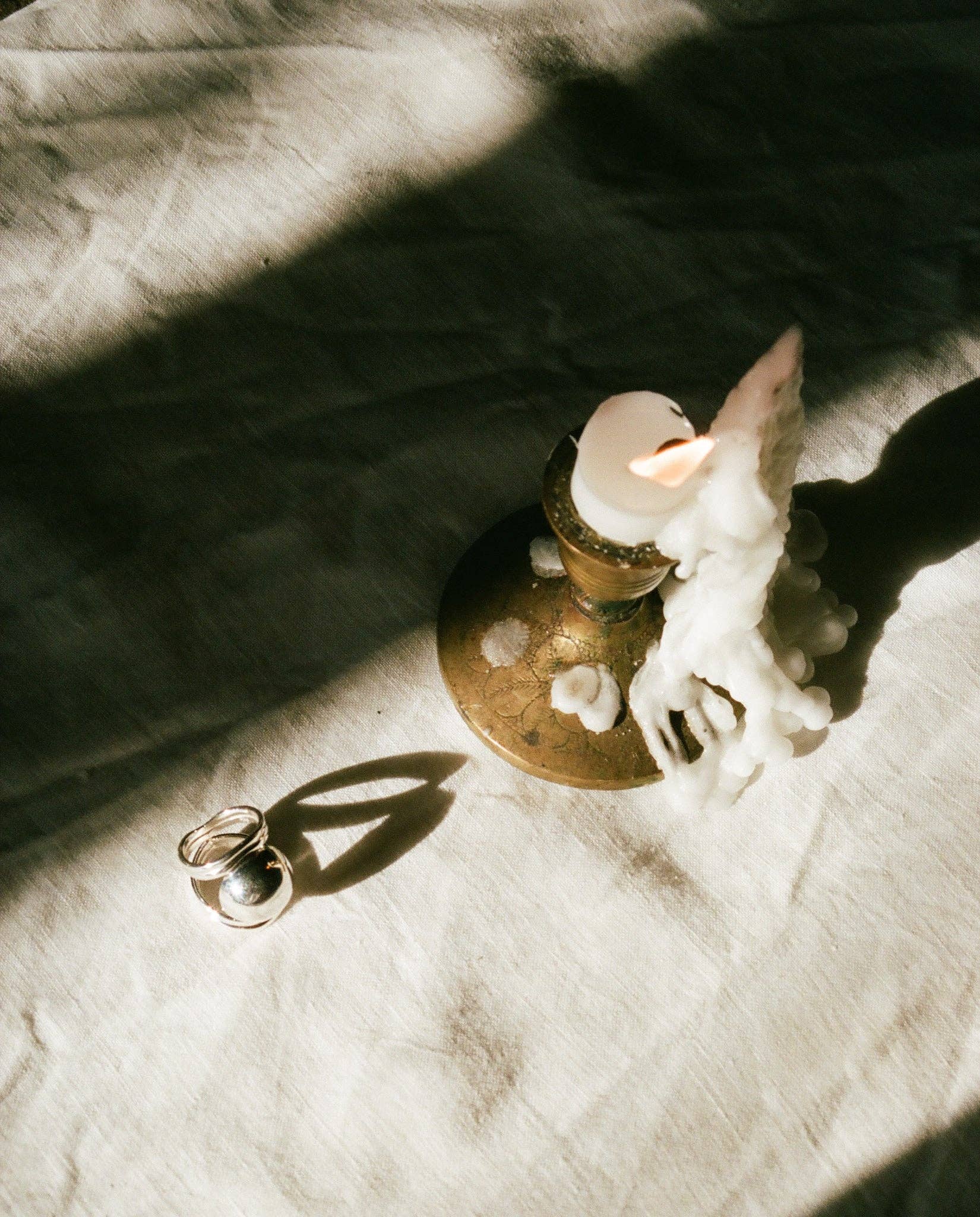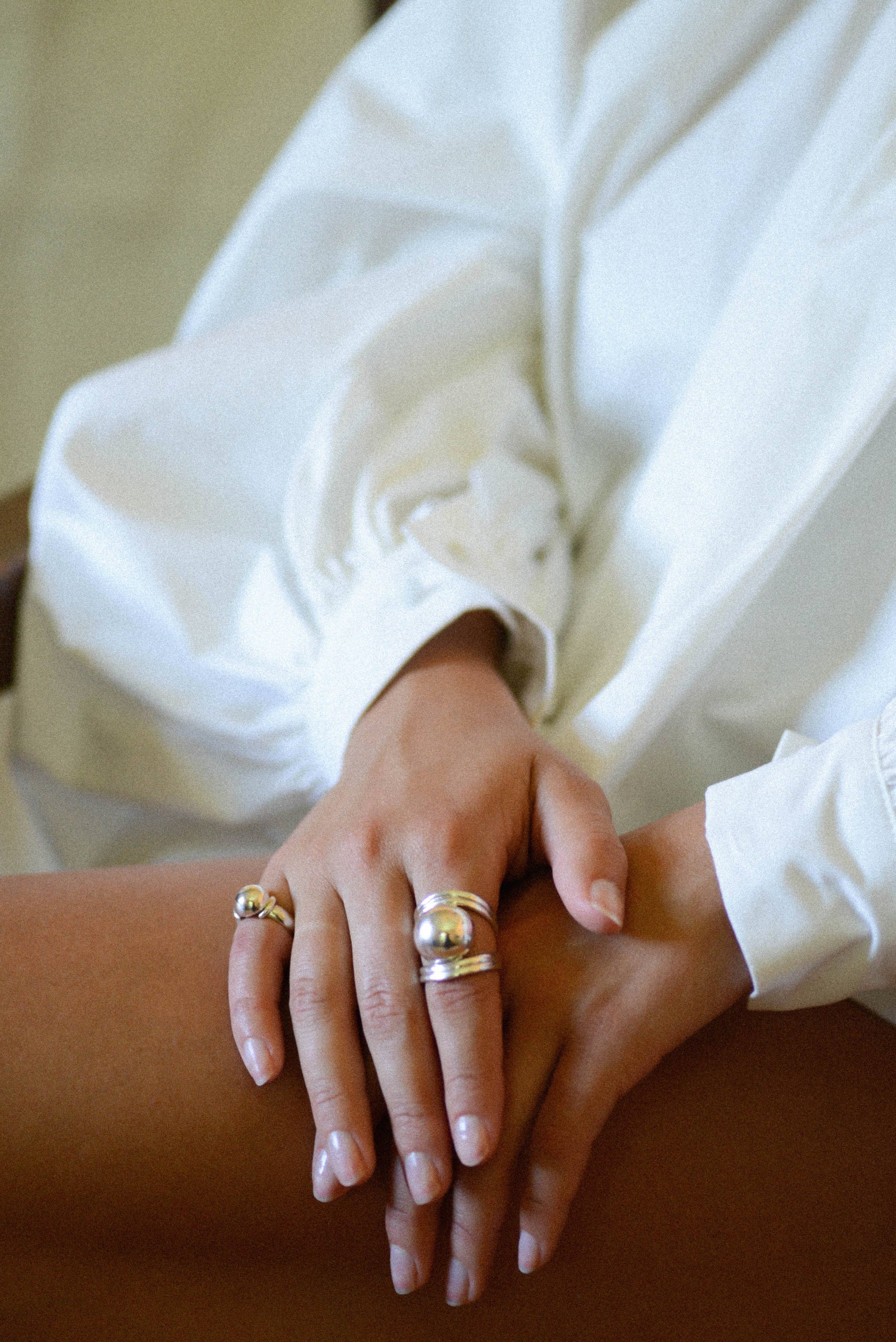 A sculptural sterling silver ring featuring a bold, polished dome detail balanced by smooth, rounded band elements. Designed to feel substantial yet wearable, this piece makes a statement on its own while still pairing effortlessly with other rings.
