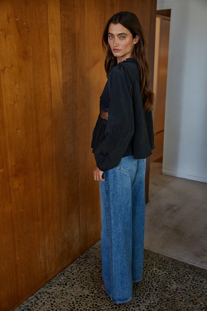 Black Satin Lace Ruffled Long Sleeve Blouse