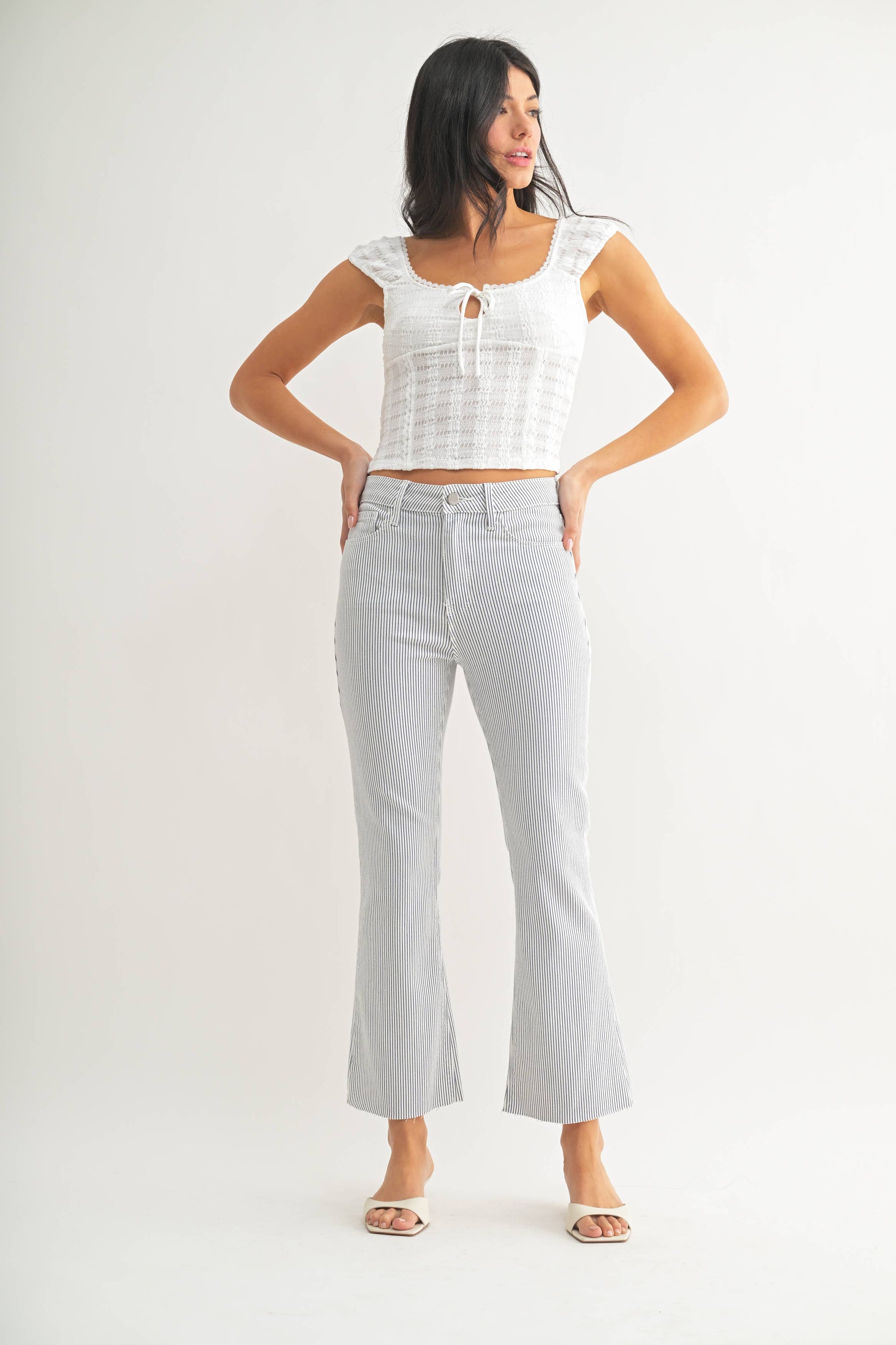 Mid rise blue striped kick flare jean. Slim from the hips to thighs with a gently flared leg and perfectly cropped to show off a chic pair of shoes. With just enough stretch for all-day comfort, The Cropped Demi Flare is destined to be a fast-favorite.