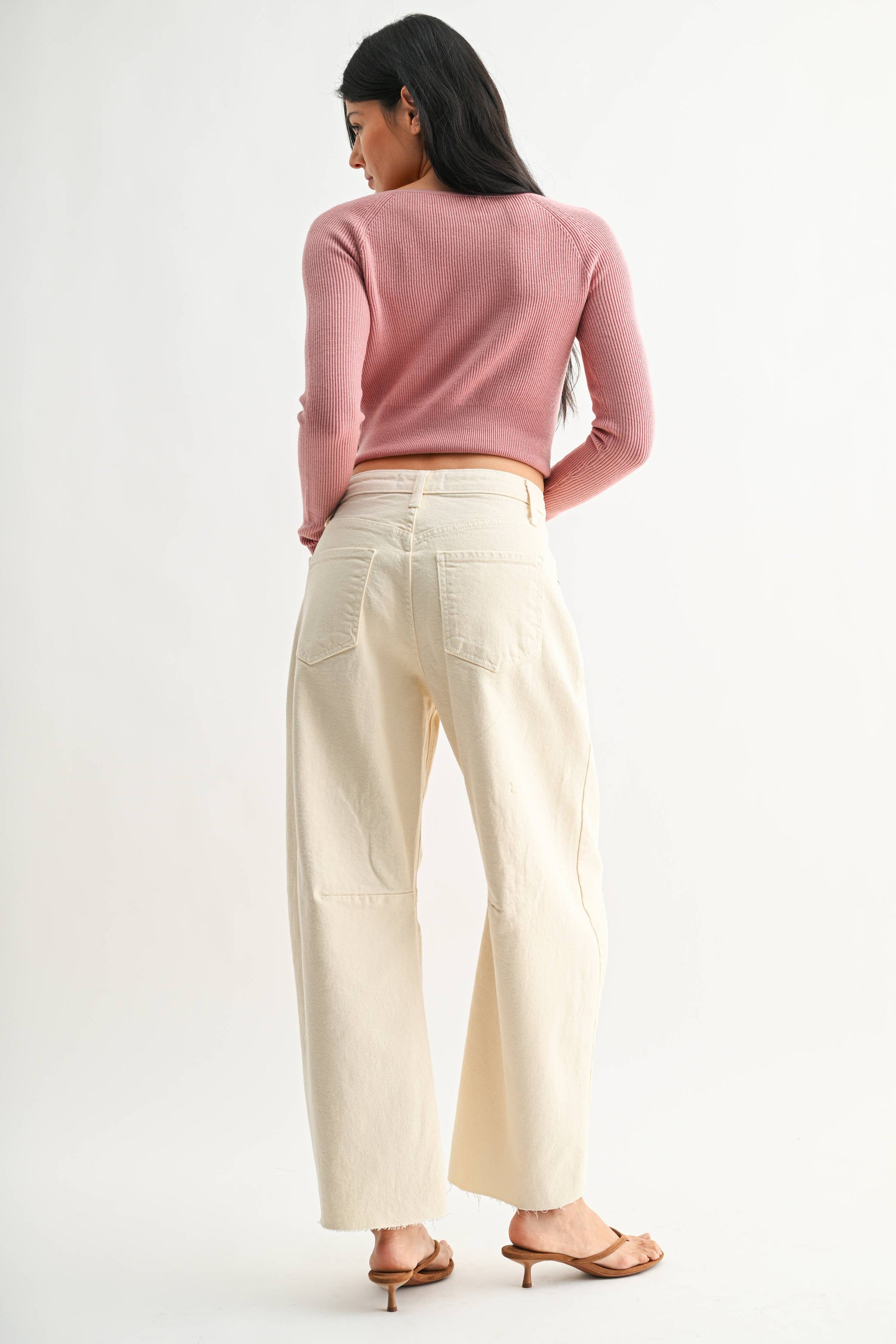 These high rise barrel jeans are designed in a soft almond wash with seam detailing through the leg. The structured silhouette is balanced with stretch for comfort and ease. Clean and modern with subtle shape through the leg.