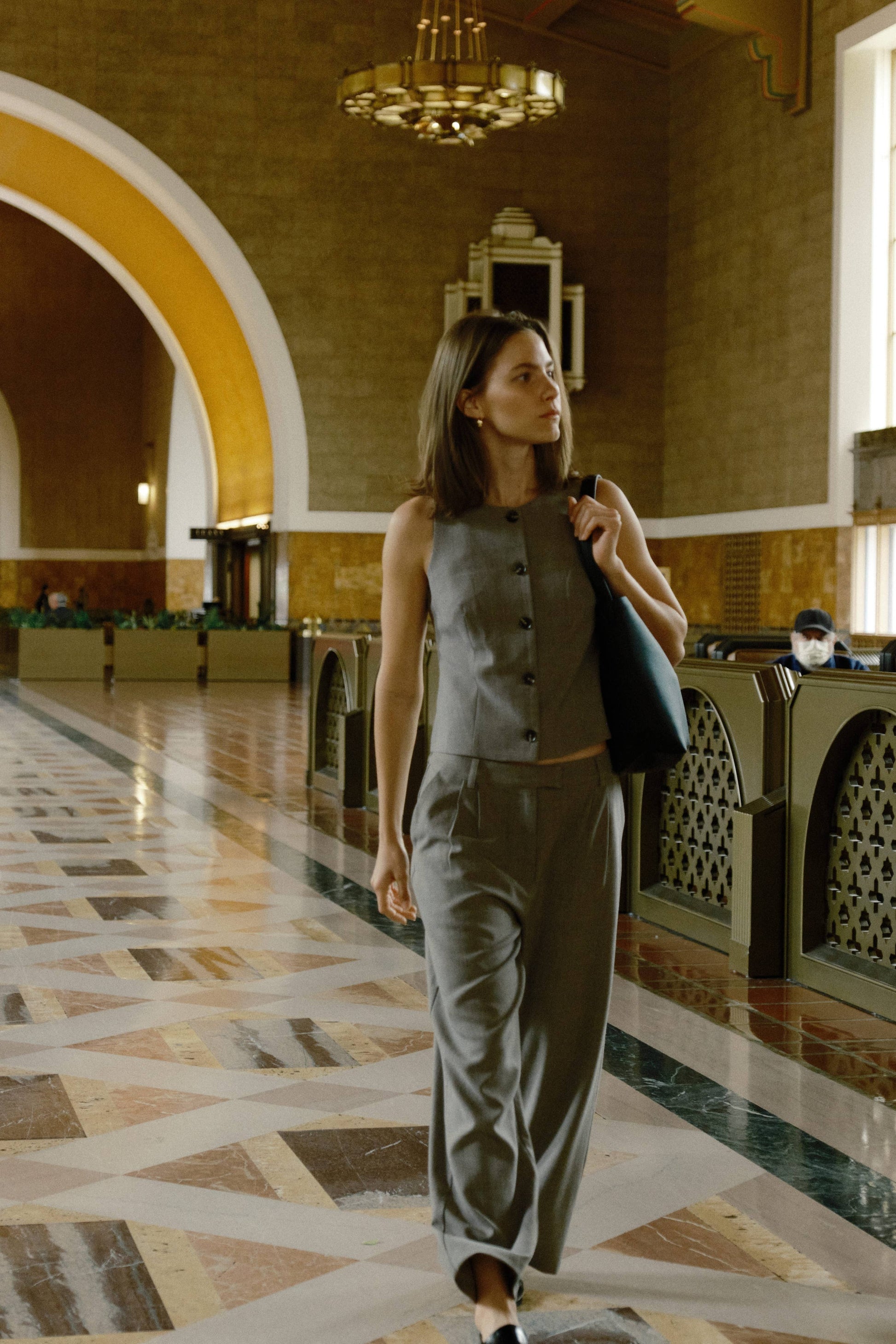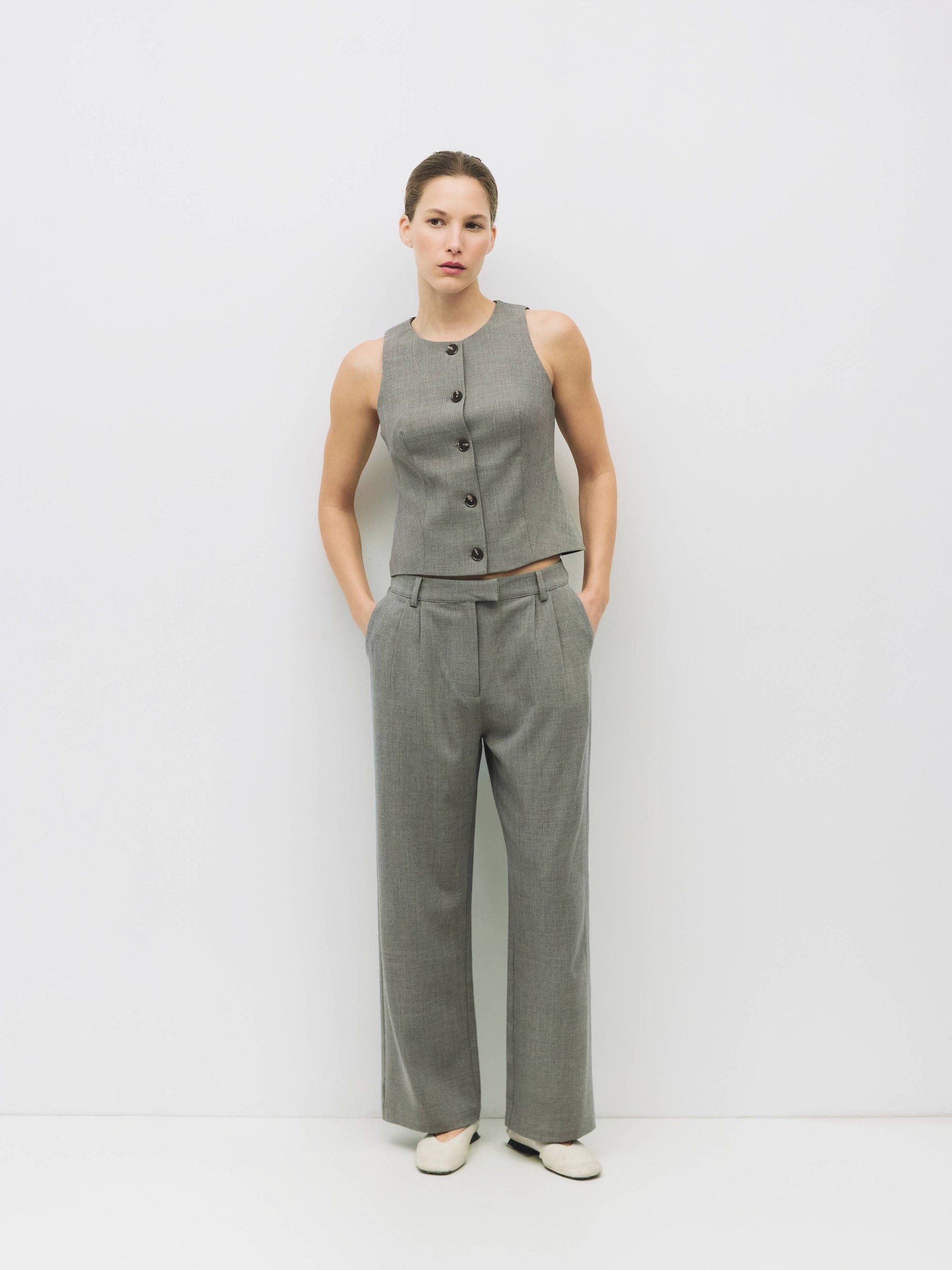 The Andrea Top is a refined take on the sleeveless vest. Designed with a round neckline, front button closure, and tailored princess seams for a fitted, polished silhouette.