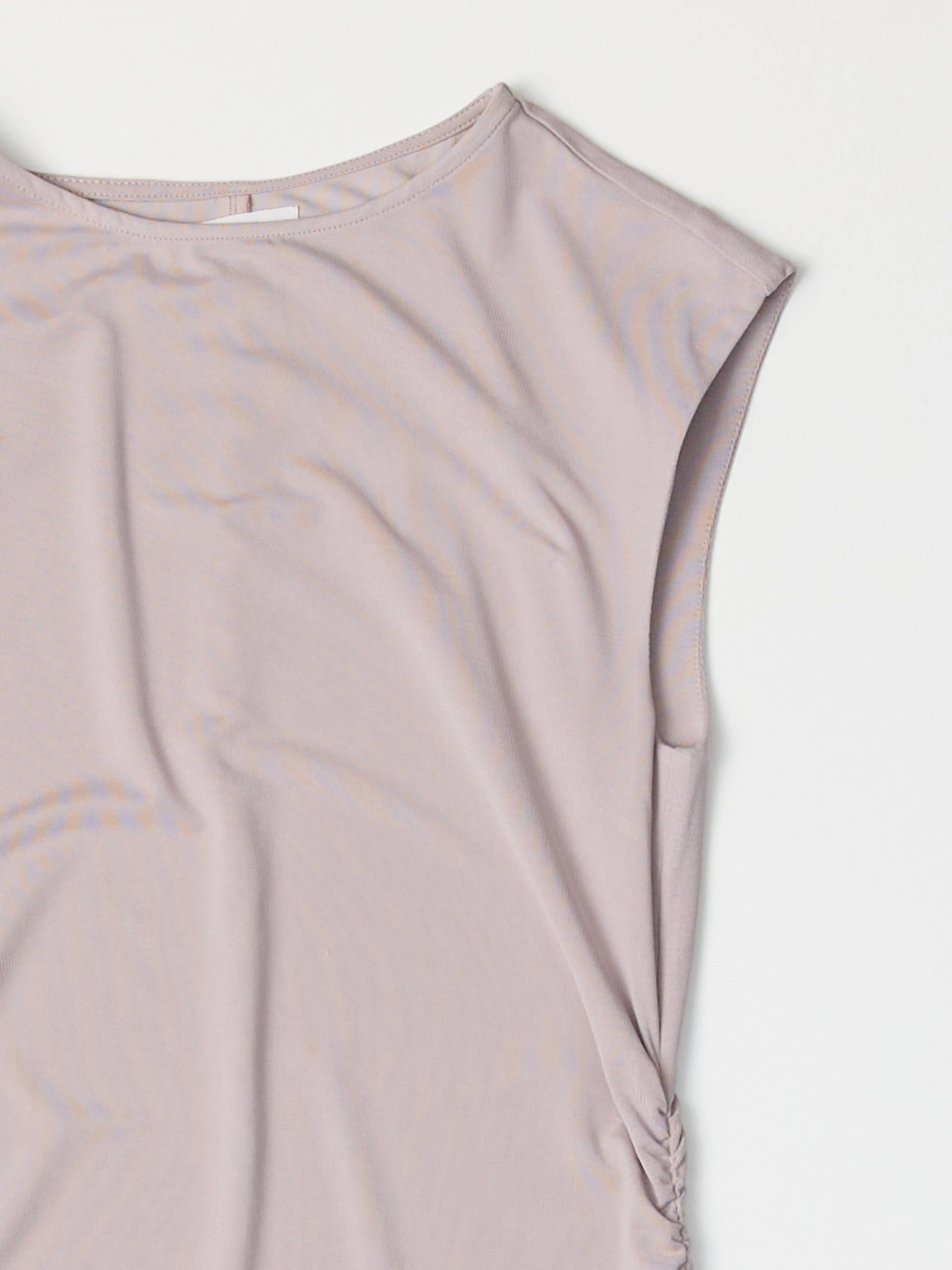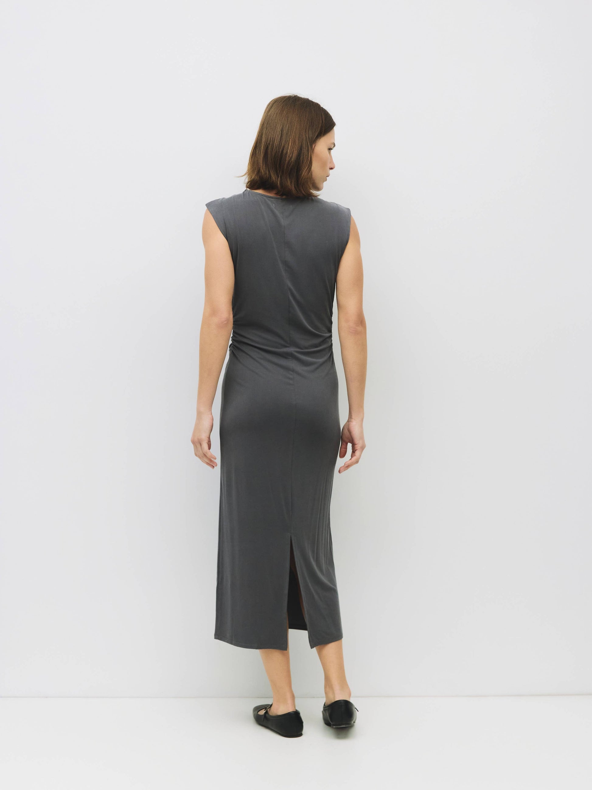 A sleeveless, fitted midi dress made from a soft charcoal cupro knit with a touch of spandex for stretch. The shirring details on the right shoulder and waistline and back slit for added movement makes this dress both flattering and comfortable.