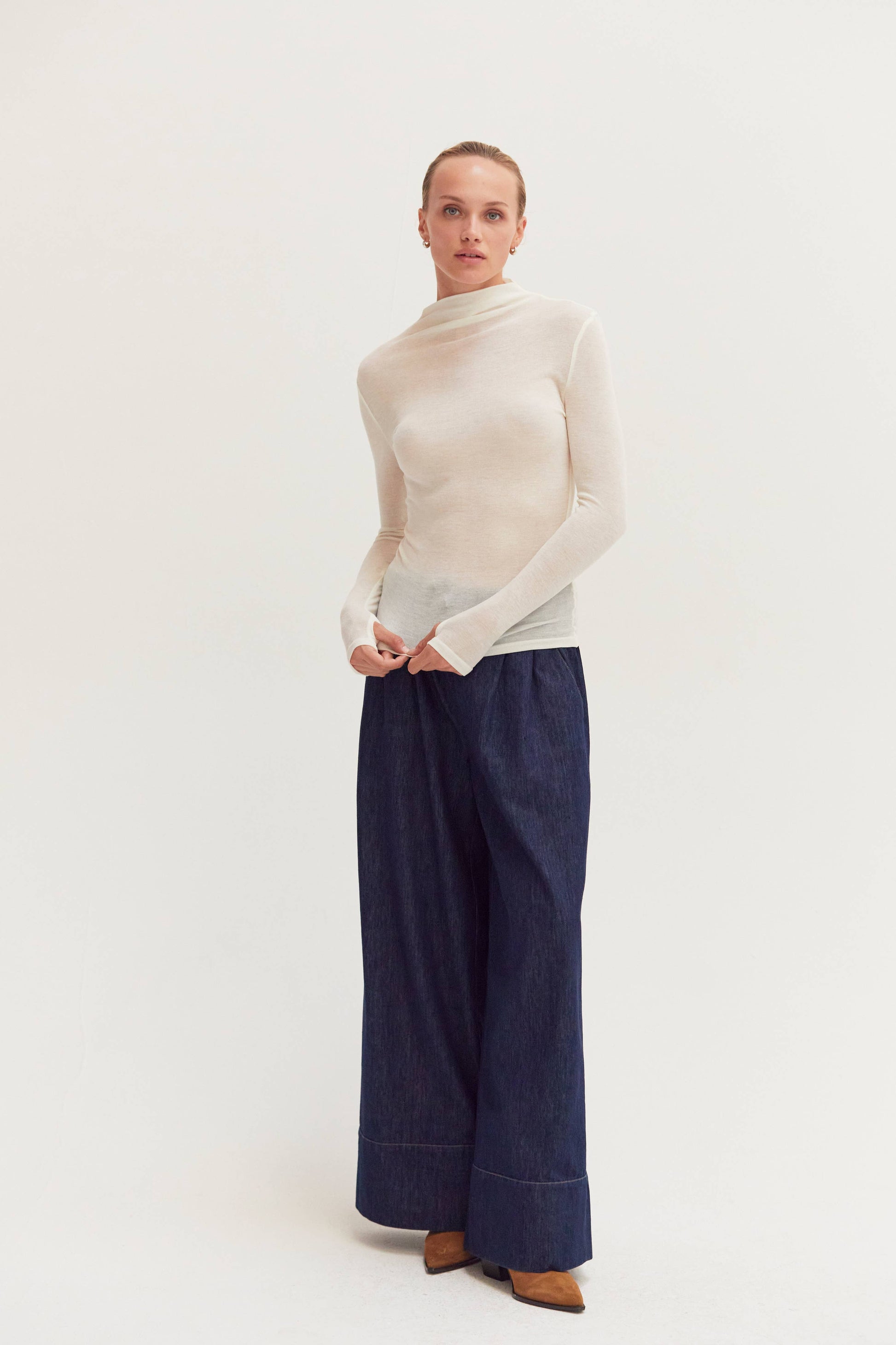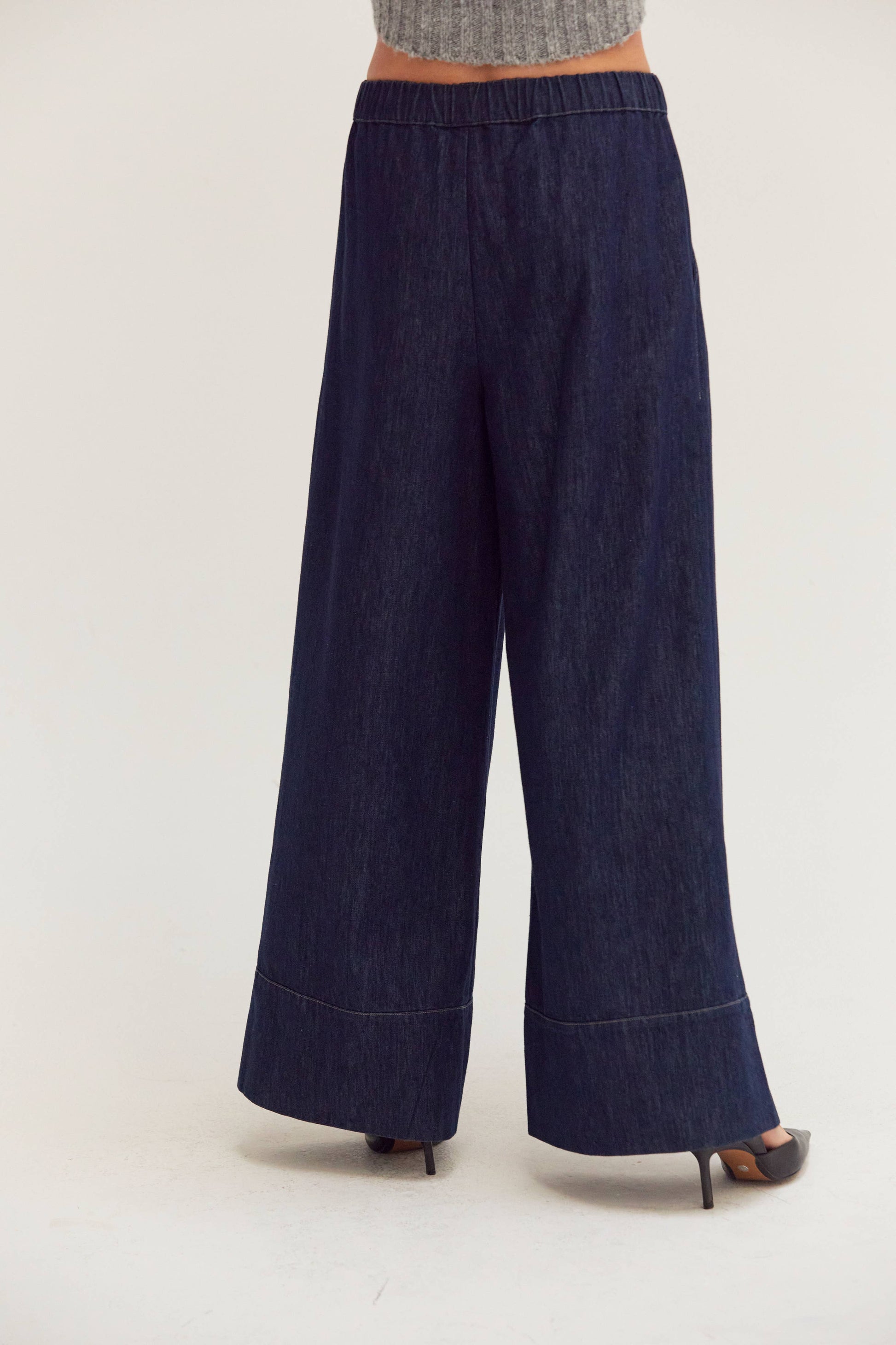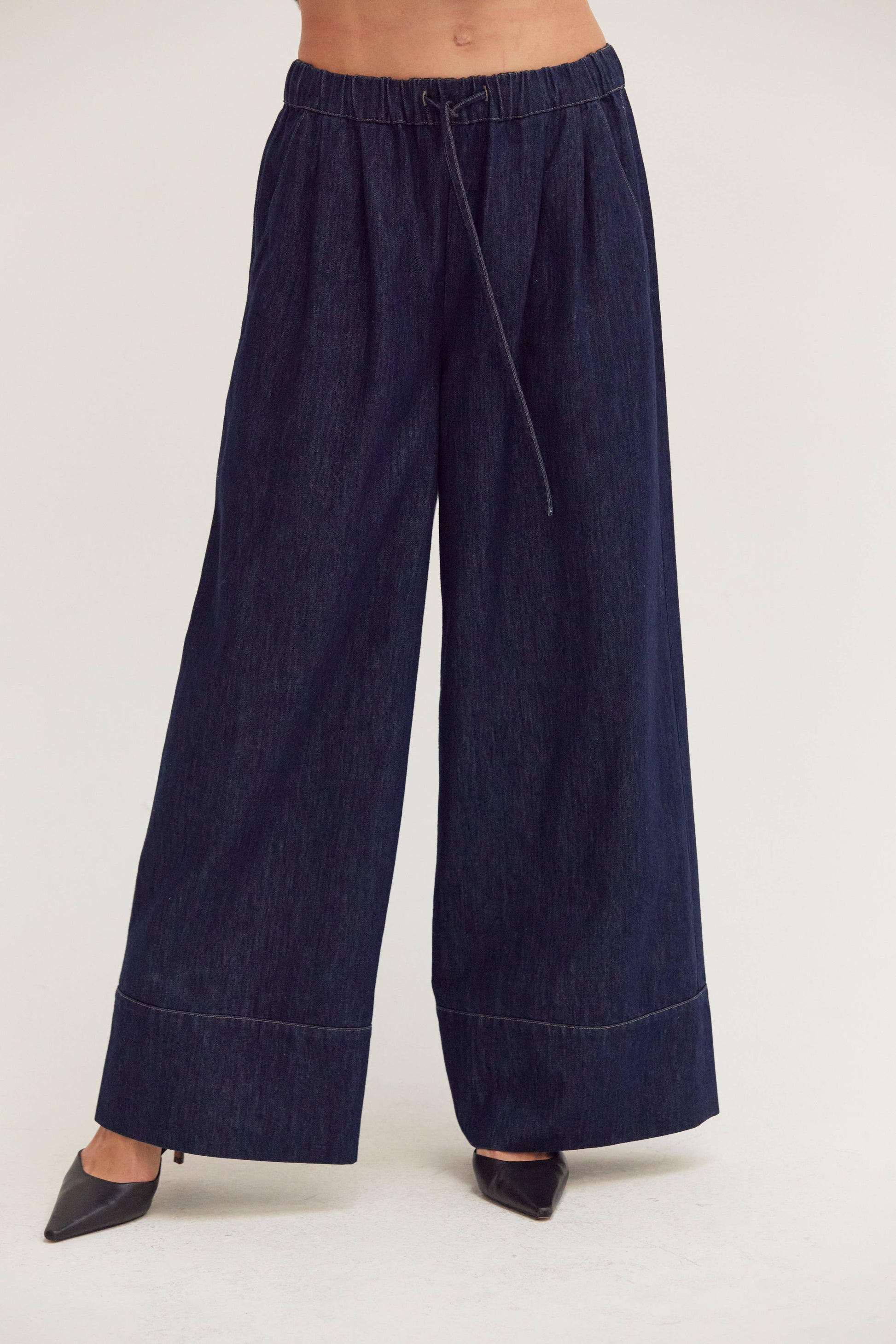 Dark denim chambray wide leg pants feature a soft cotton-blend fabric with a relaxed, high-rise silhouette. Designed with an elasticized waistband and adjustable drawstring for all-day comfort, they offer easy movement and a polished, laid-back look. Slant pockets and a subtle cuffed hem complete the understated, modern finish.
