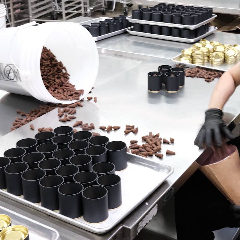 A connection blend to soak up the present moment, with notes of soft sage, ginger root, lavender, and patchouli. Inspired by overgrown wildflowers rooted in fresh earth, formulated with upcycled cedarwood and sustainable patchouli. Alchemy Incense Cones are packaged in recyclable black paper tubes containing 30 cones, featuring gold metal lids that function as burners when inverted on a heat-resistant surface. Wood-based incense cones are hand-dipped into fine fragrance oils at our Los Angeles factory. Alchemy Incense Cones burn for 20-25 minutes each.