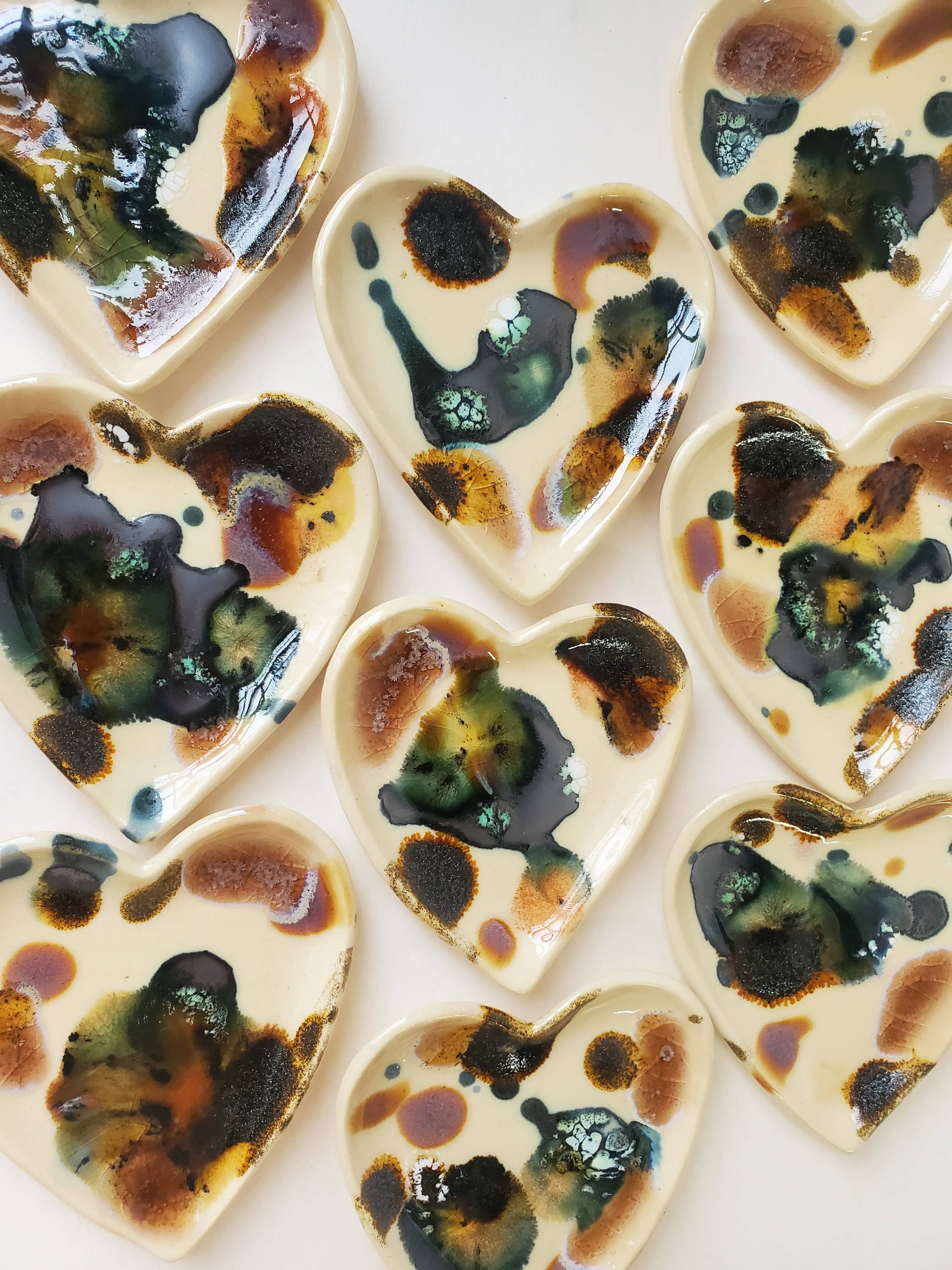 Hand-cut from stoneware clay, each heart trinket dish features an organic, sculpted shape with a unique marbled glaze finish. Available in three colorways, every piece will vary slightly, making each dish one-of-a-kind. Perfect for holding jewelry, small keepsakes, palo santo, incense cones, or adding a sweet decorative touch to any space.