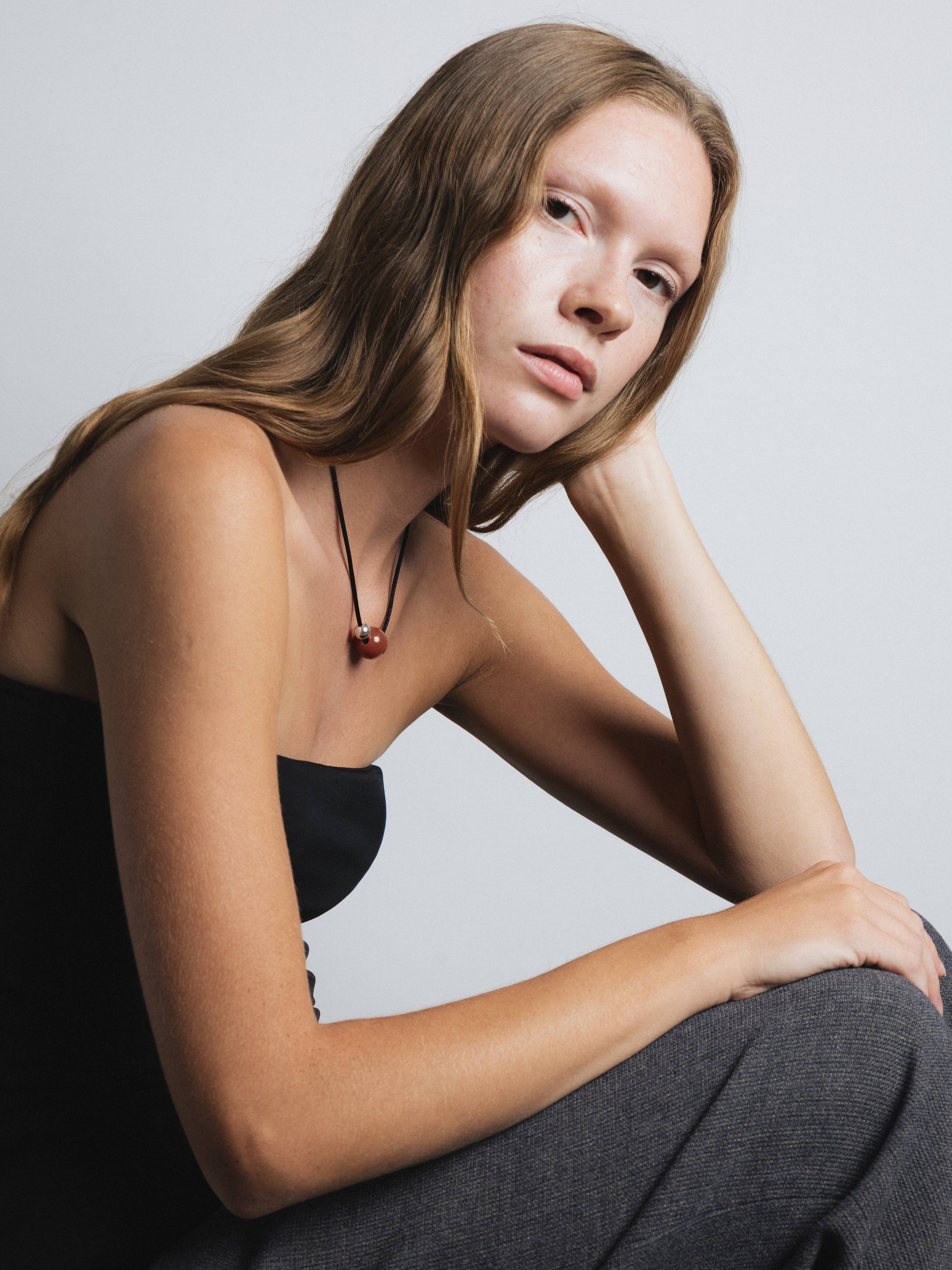Bold and minimal, this necklace features a smooth red agate statement bead paired with a polished 925 sterling silver accent. Strung on a black satin cord, it offers an effortless, modern look with a touch of earthy warmth. Finished with a sterling silver clasp for comfortable, everyday wear.