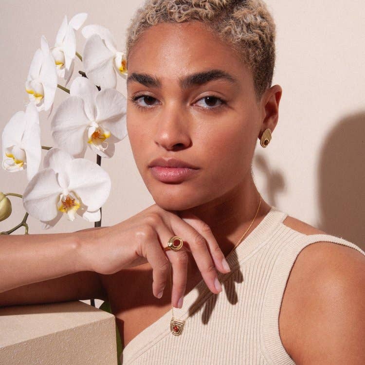 Inspired by sculptural architecture, the Mira Ring features a bold, substantial silhouette that feels refined and effortlessly wearable. A flush-set natural carnelian stone anchors the design, adding warmth and grounding energy to the modern, curved form.