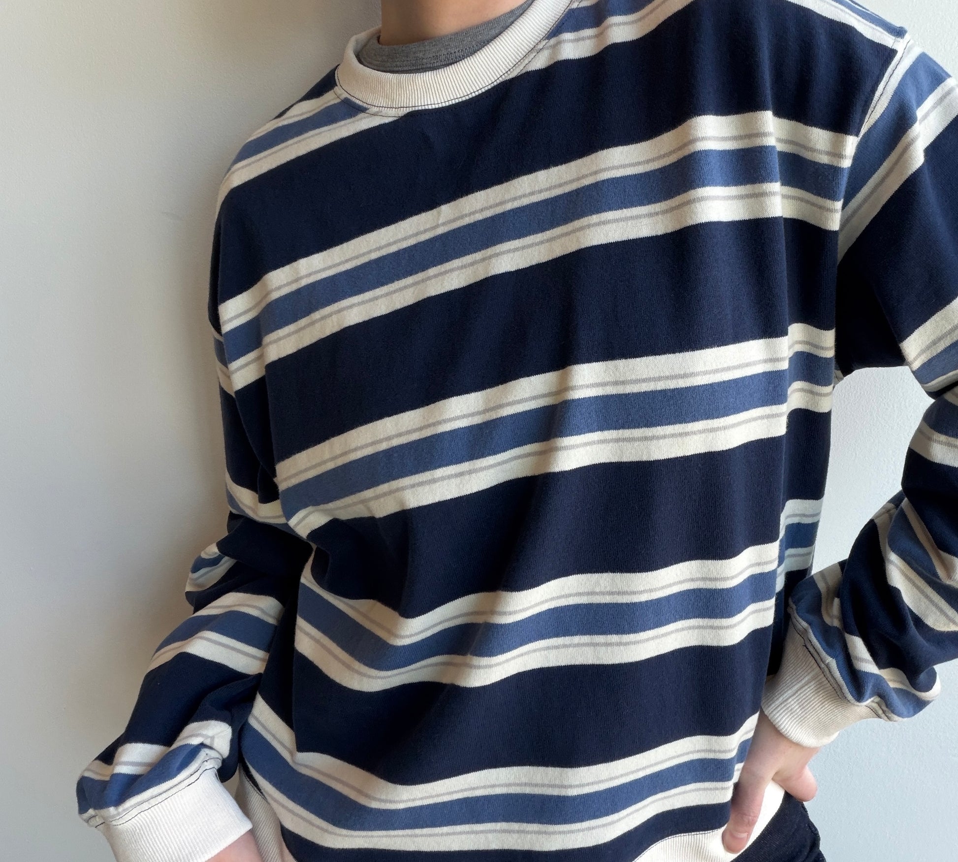 Navy Blue Striped Jersey Pullover – 100% Cotton Long Sleeve Crew Neck Top