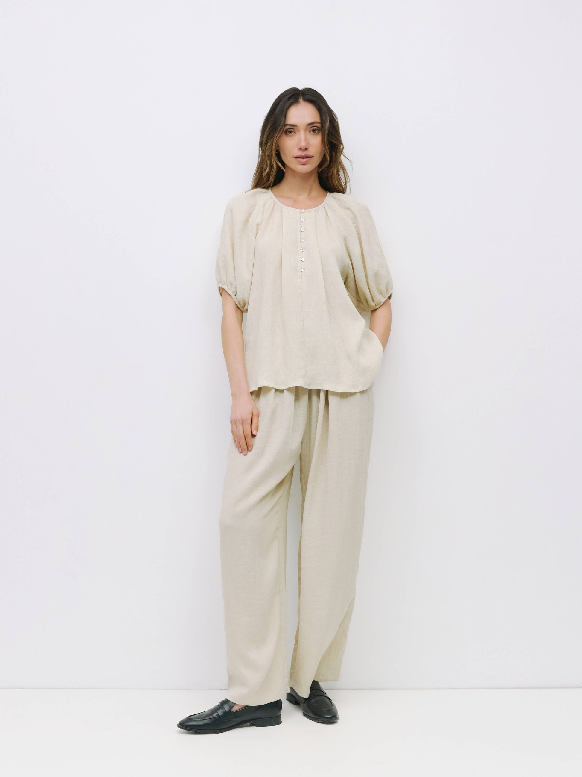 A loose-fitting blouse with a partial shell button closure, puff sleeves for a relaxed yet structured look, pleated neckline, and shell button details on the sleeves.