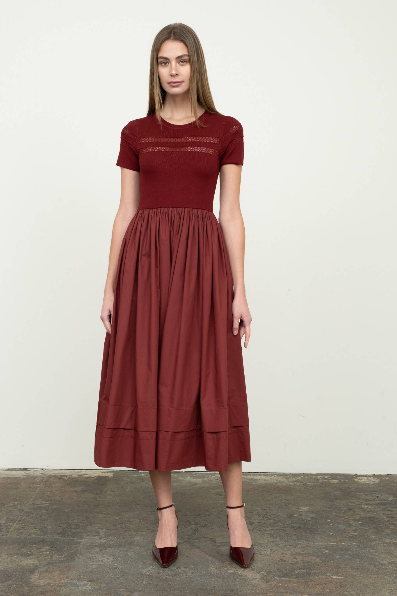 Black mixed media midi dress. Knit top with sheer inserts. Cotton skirt.