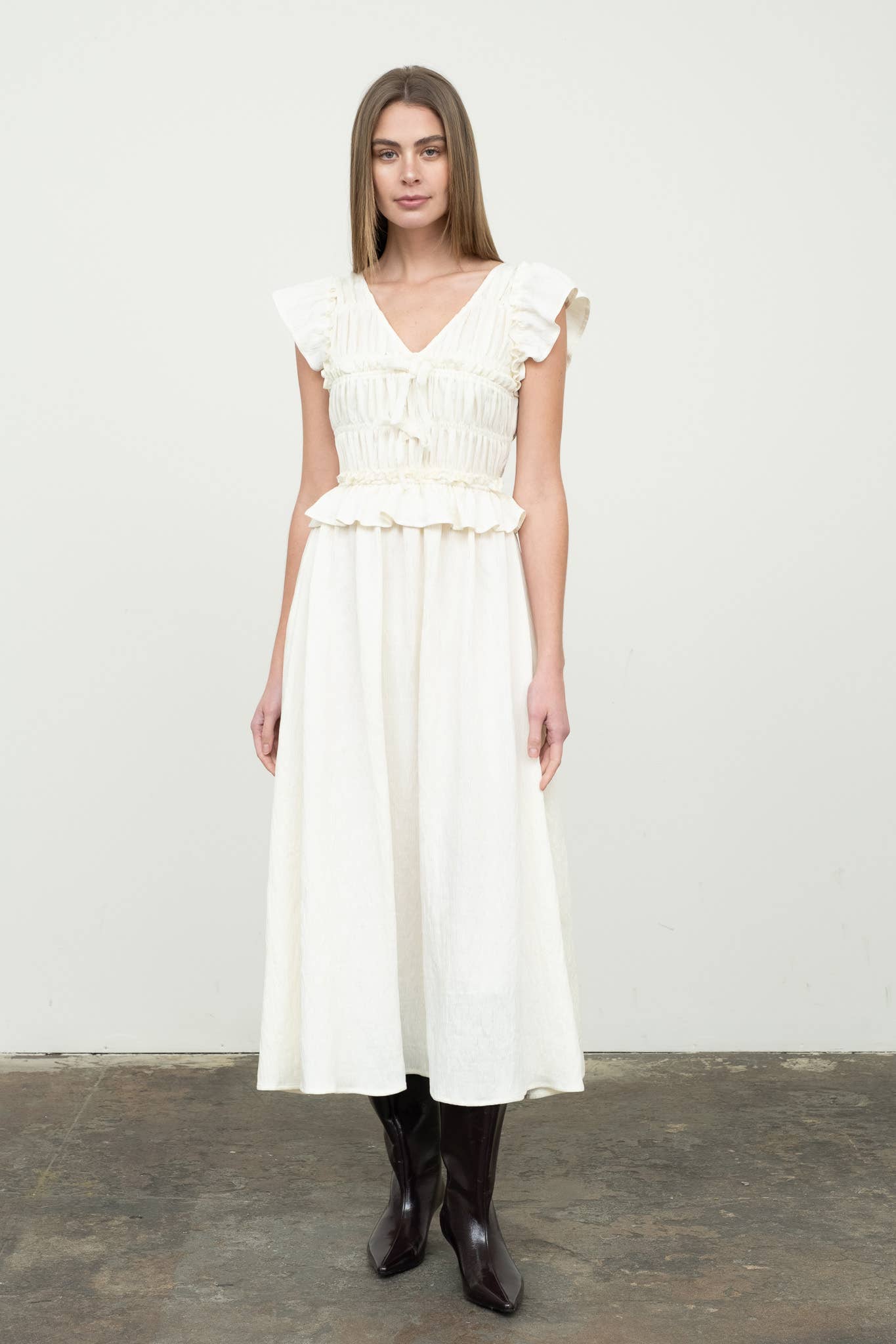 Black Shirred V-Neck Ruffle Trim Midi Dress