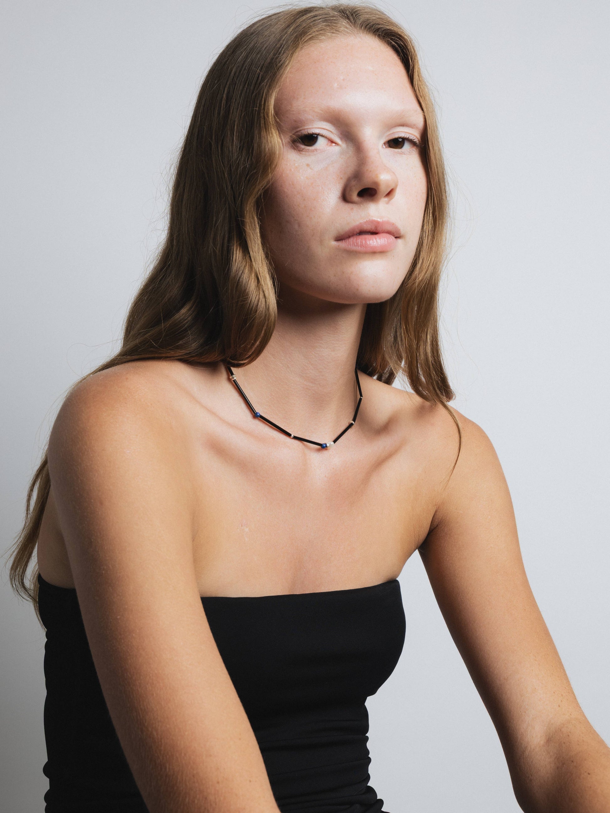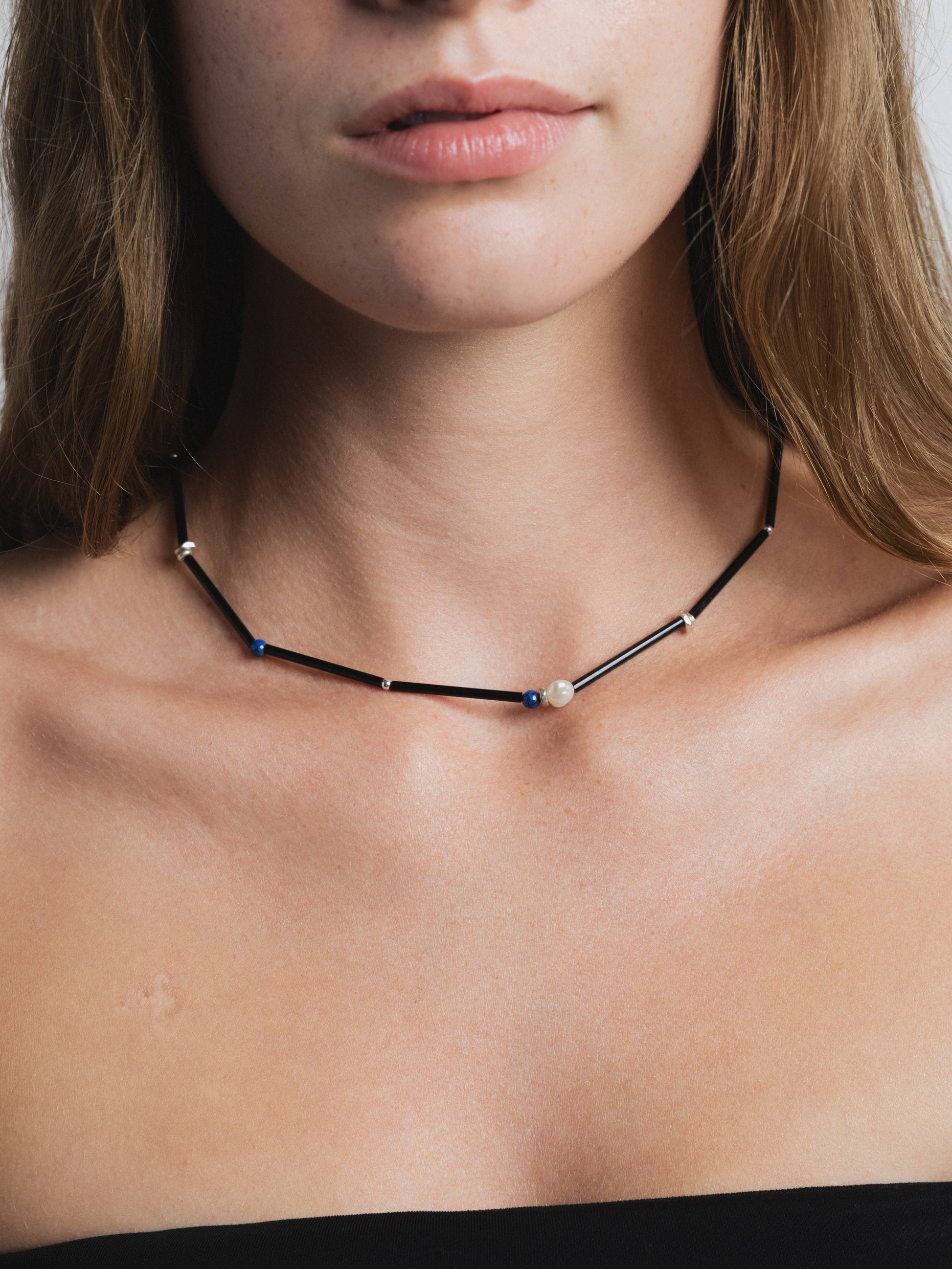 Artful and modern, this mixed-bead necklace features sleek black tube beads accented with deep blue lapis stones, freshwater pearls, and 925 sterling silver details. Finished with a sterling silver clasp, it brings together clean design and organic texture — an elevated everyday piece with subtle color and shine.