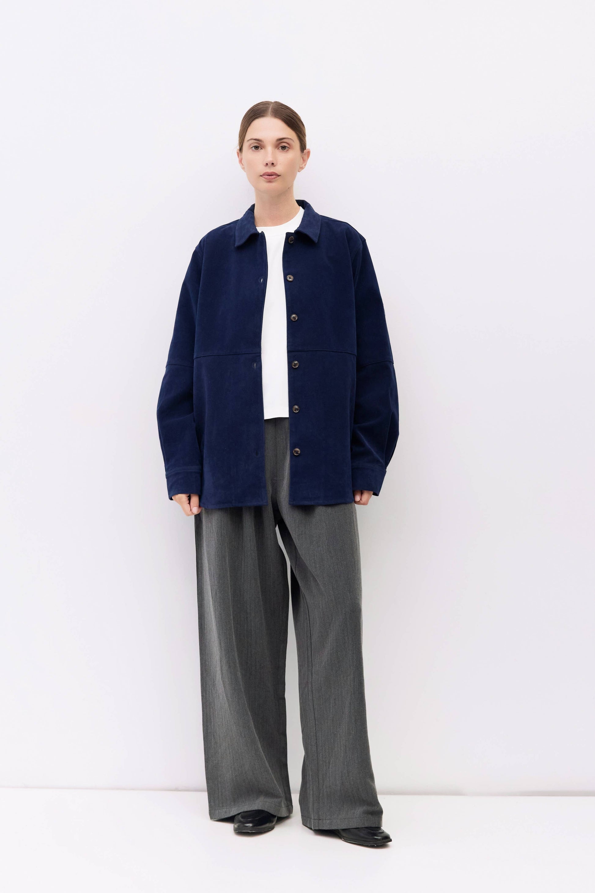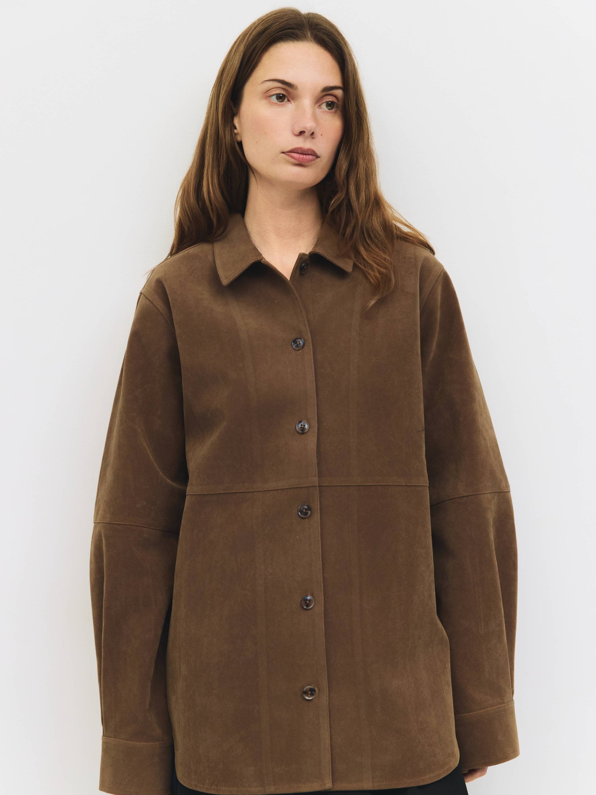 An oversized button-down jacket made from soft faux suede, featuring a classic collar and long sleeves. Designed with a relaxed fit for easy layering, it adds a touch of warmth and texture to any outfit — perfect for transitional weather and everyday wear.