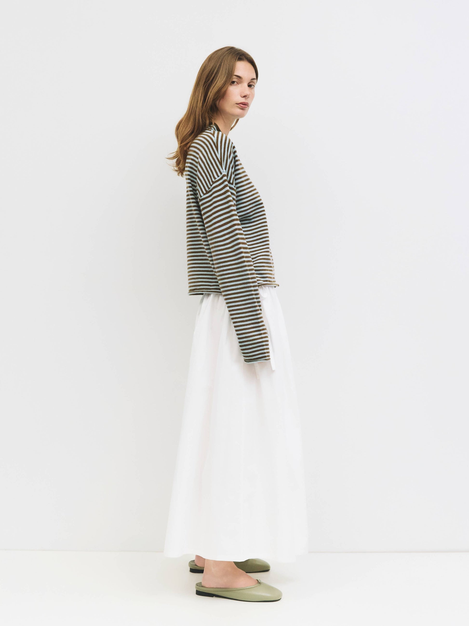 A striped button-down cardigan designed for a relaxed, everyday fit. Crafted from a midweight knit, it features a crew neckline, rolled edges, and a laid-back drape that makes it perfect for layering or wearing on its own.