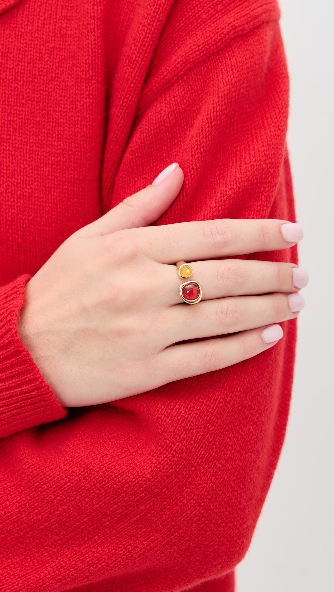 Open front statement ring featuring amber and citrine colored resin stones on either side.