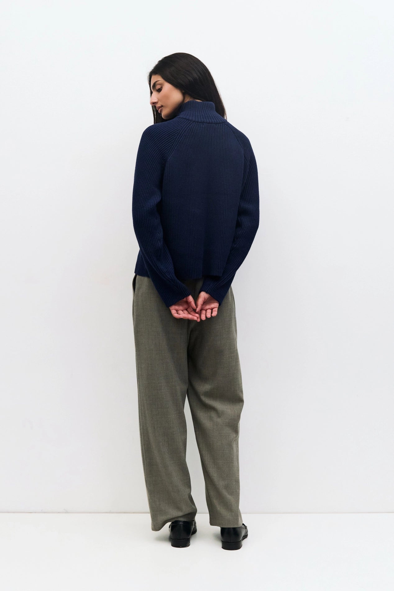 A ribbed knit sweater designed with a relaxed fit and finished with a high turtleneck and partial front zip for versatile styling. With raglan long sleeves, it offers the perfect balance of structure and ease for cooler days.