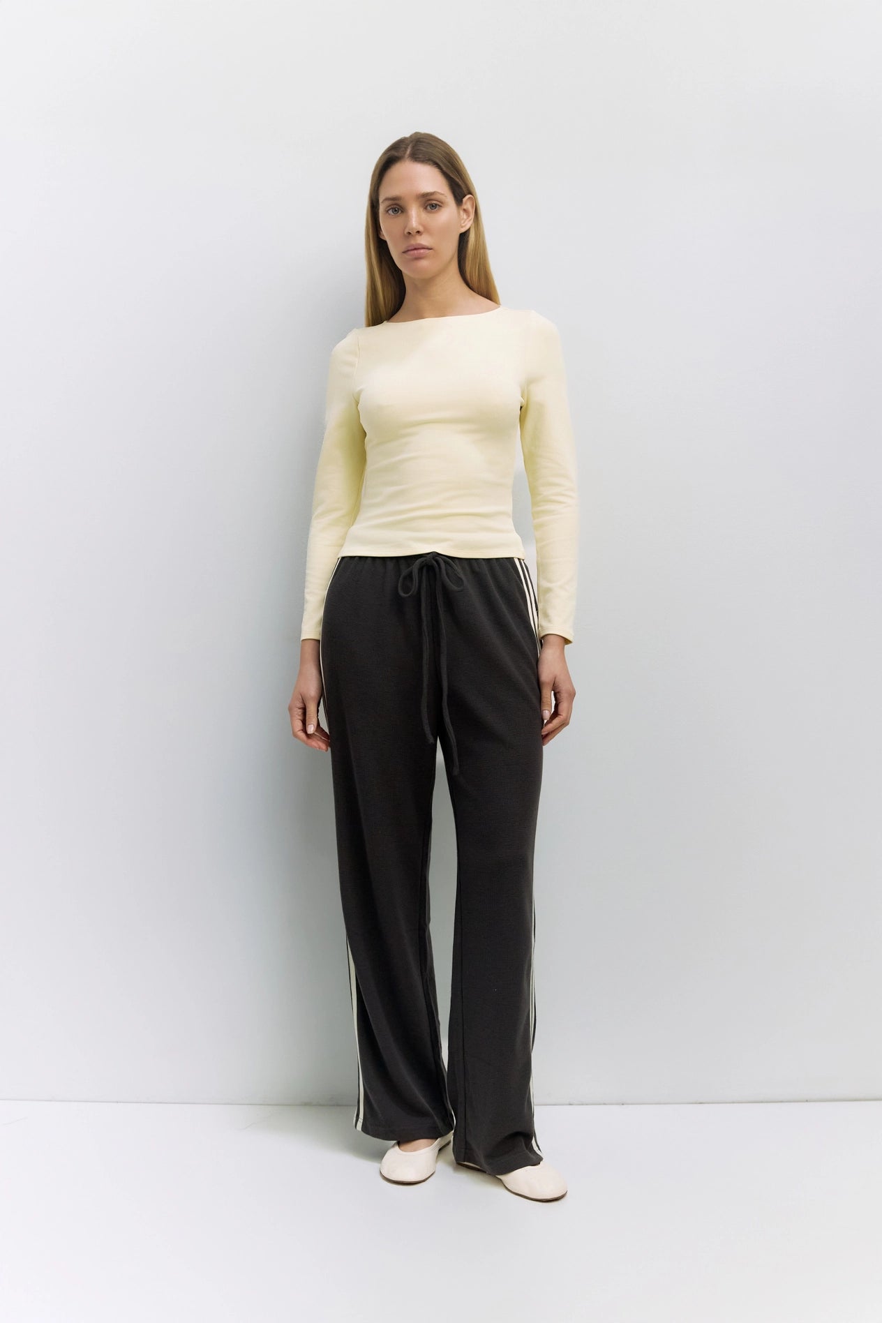 A fitted long-sleeve tee made from ultra-soft brushed jersey for a smooth, comfortable feel. Designed with a wide neckline and sleek silhouette, it’s perfect for layering or wearing on its own for a refined, everyday look.