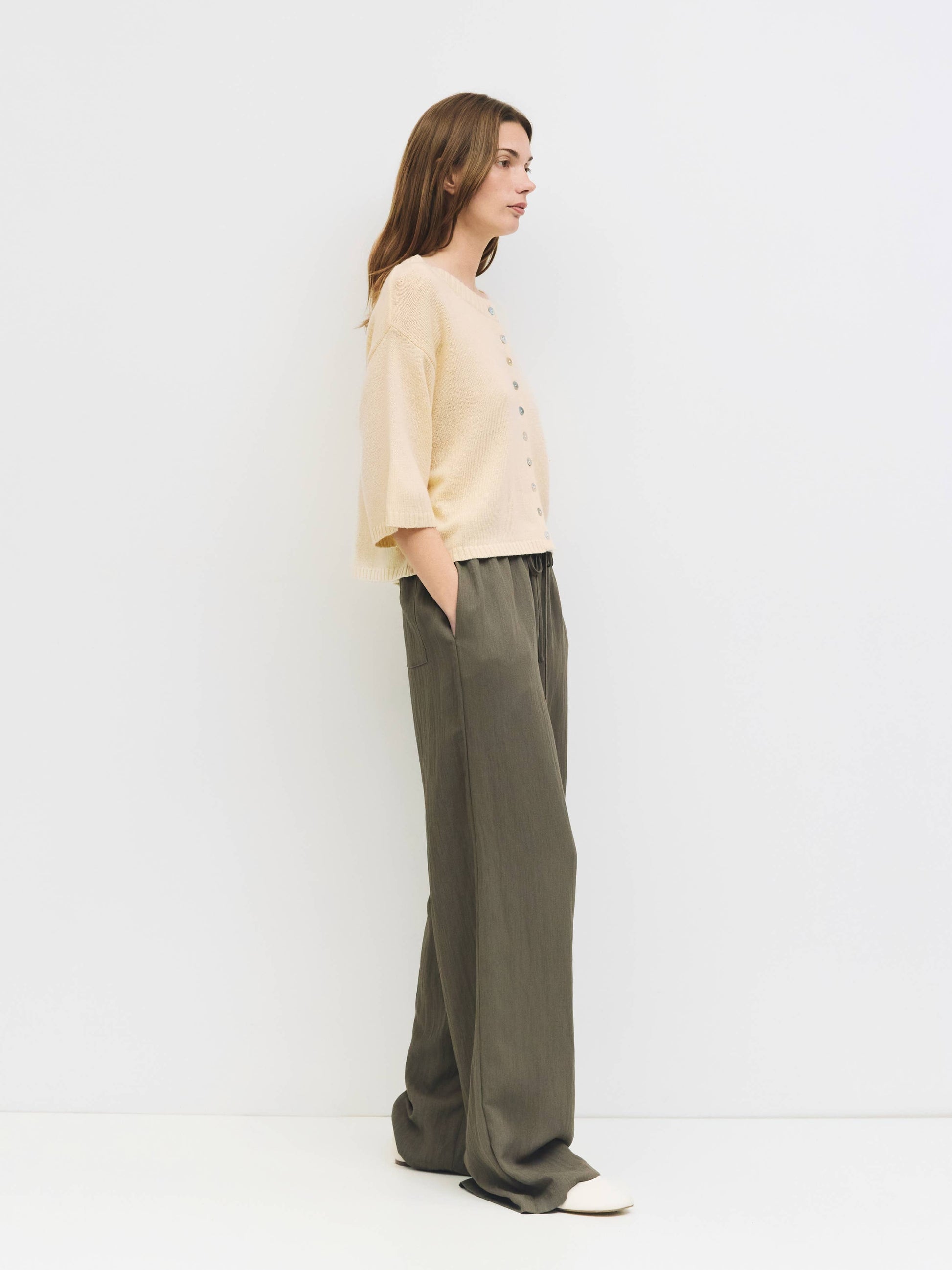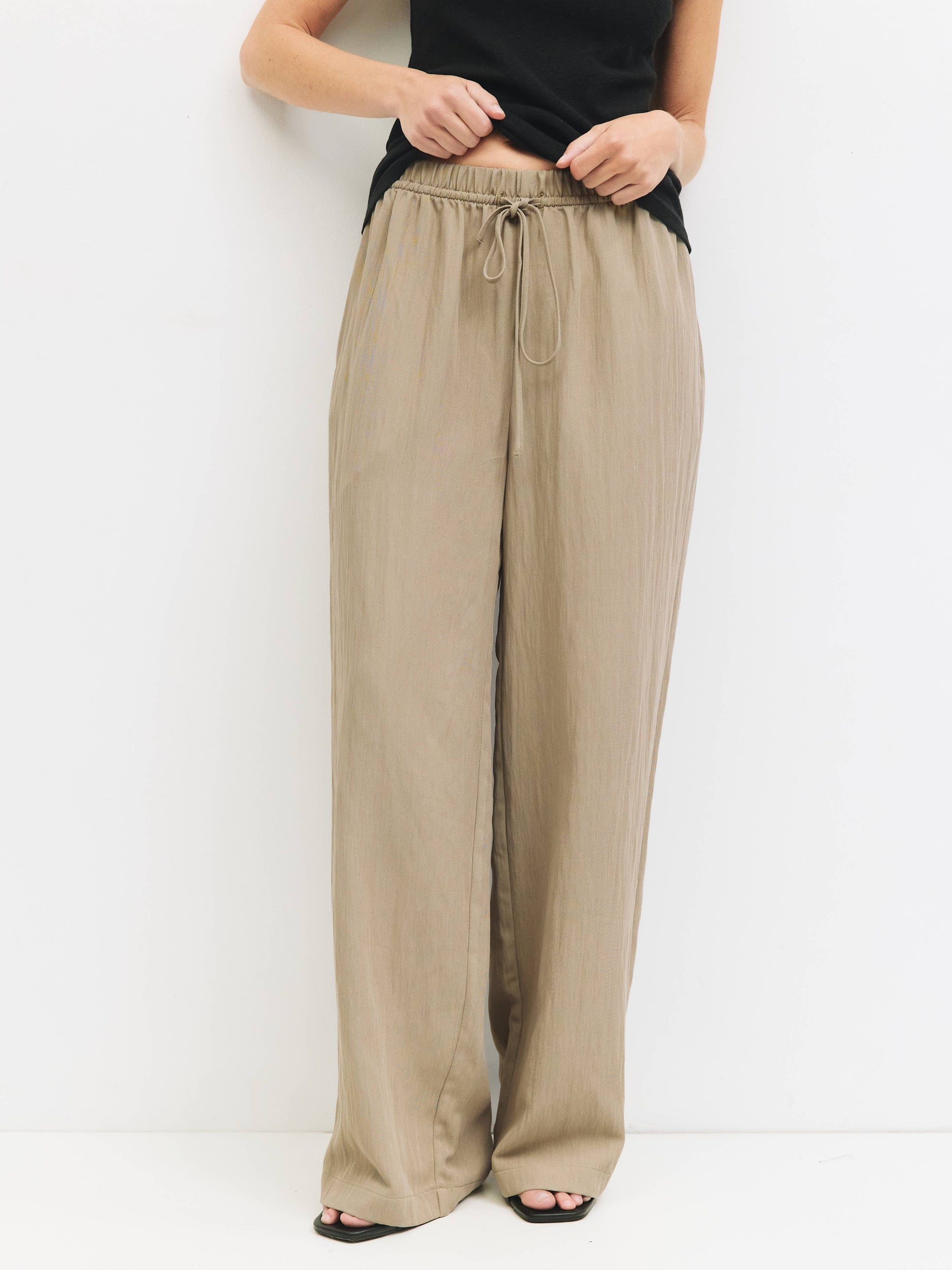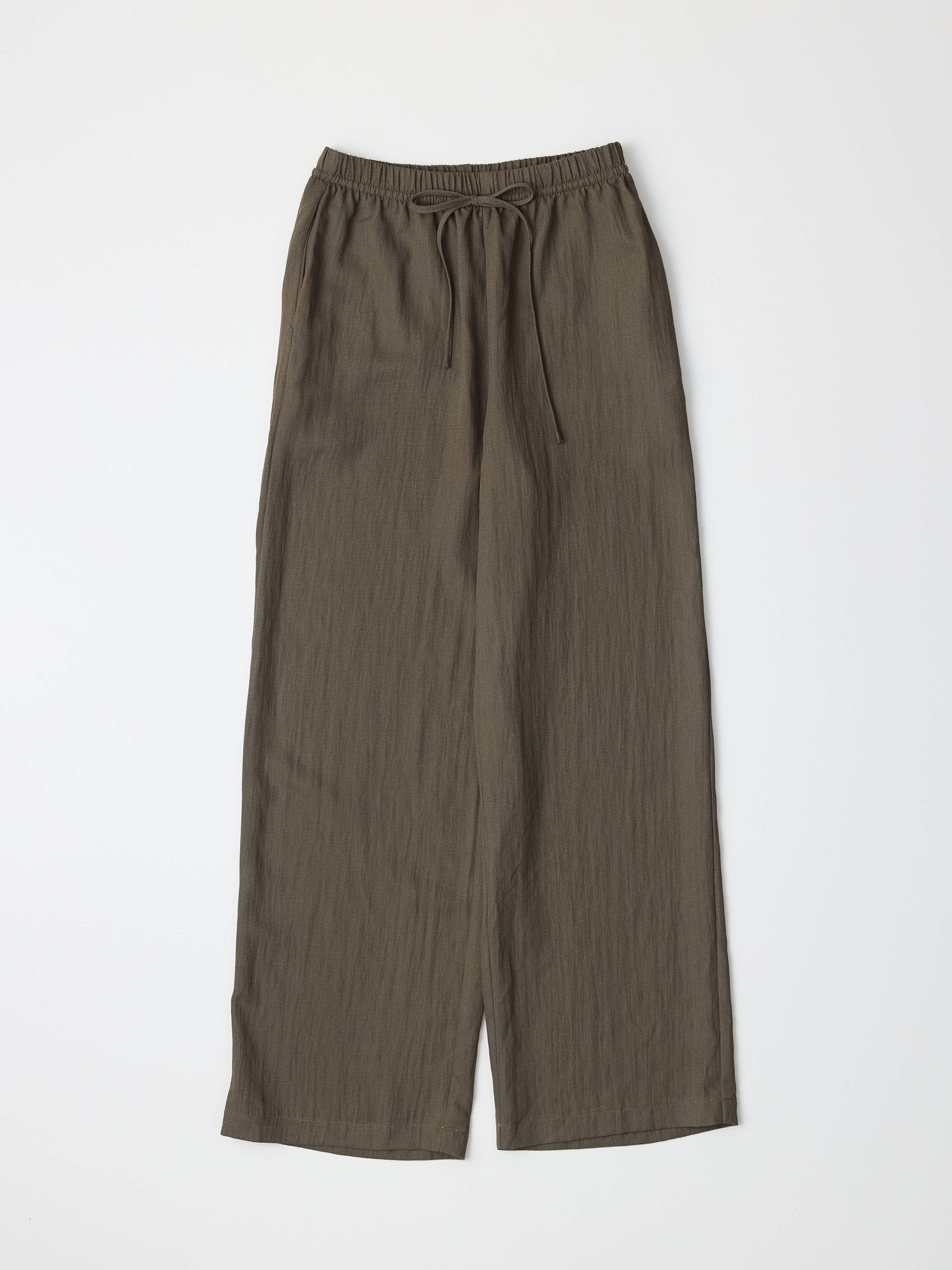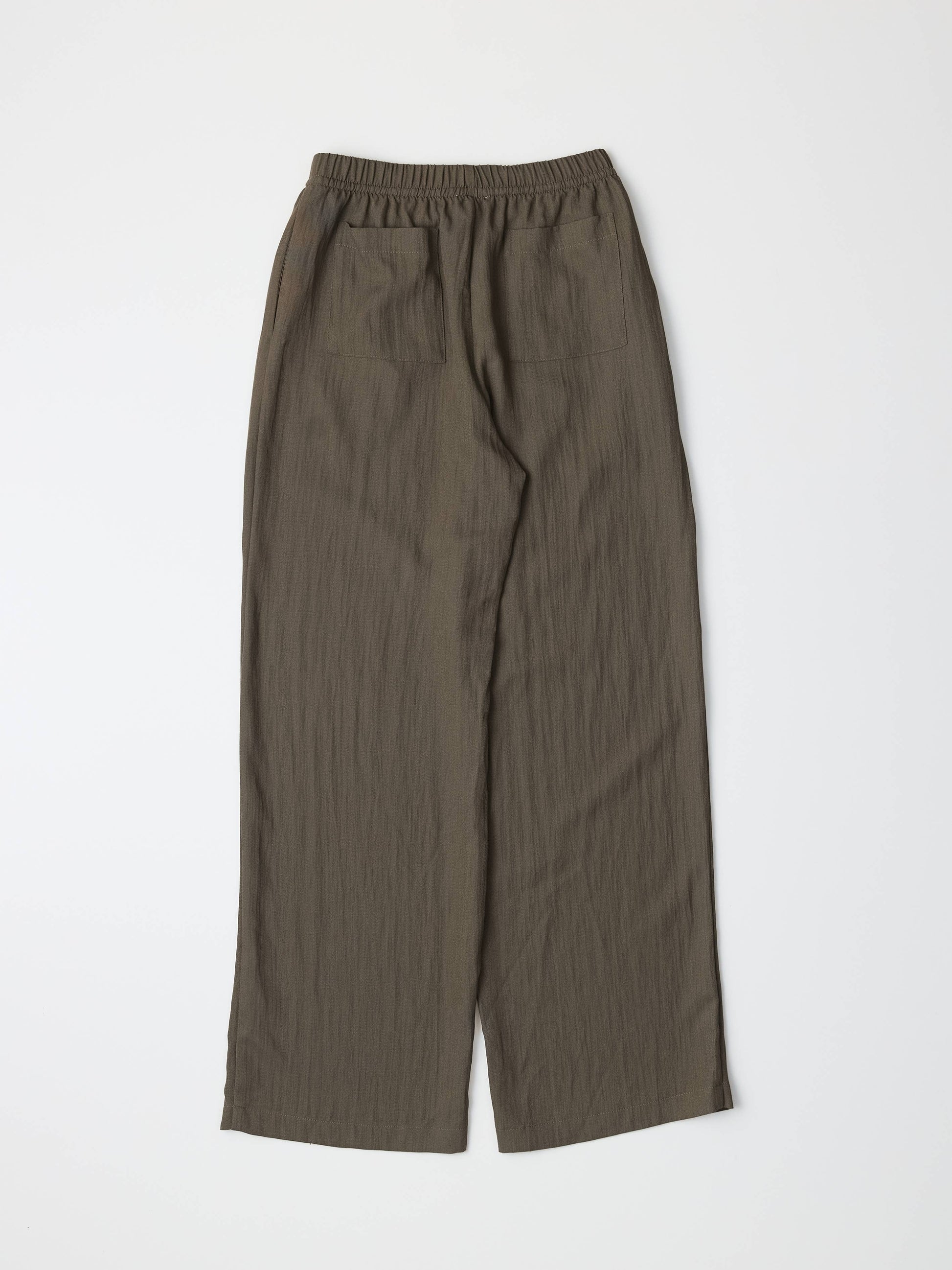 Wide-leg pull-on pants designed with an adjustable elastic waistband and feature front slit pockets and back patch pockets. Combines relaxed style with practical details in a lightweight fabric with a slight crinkled texture.