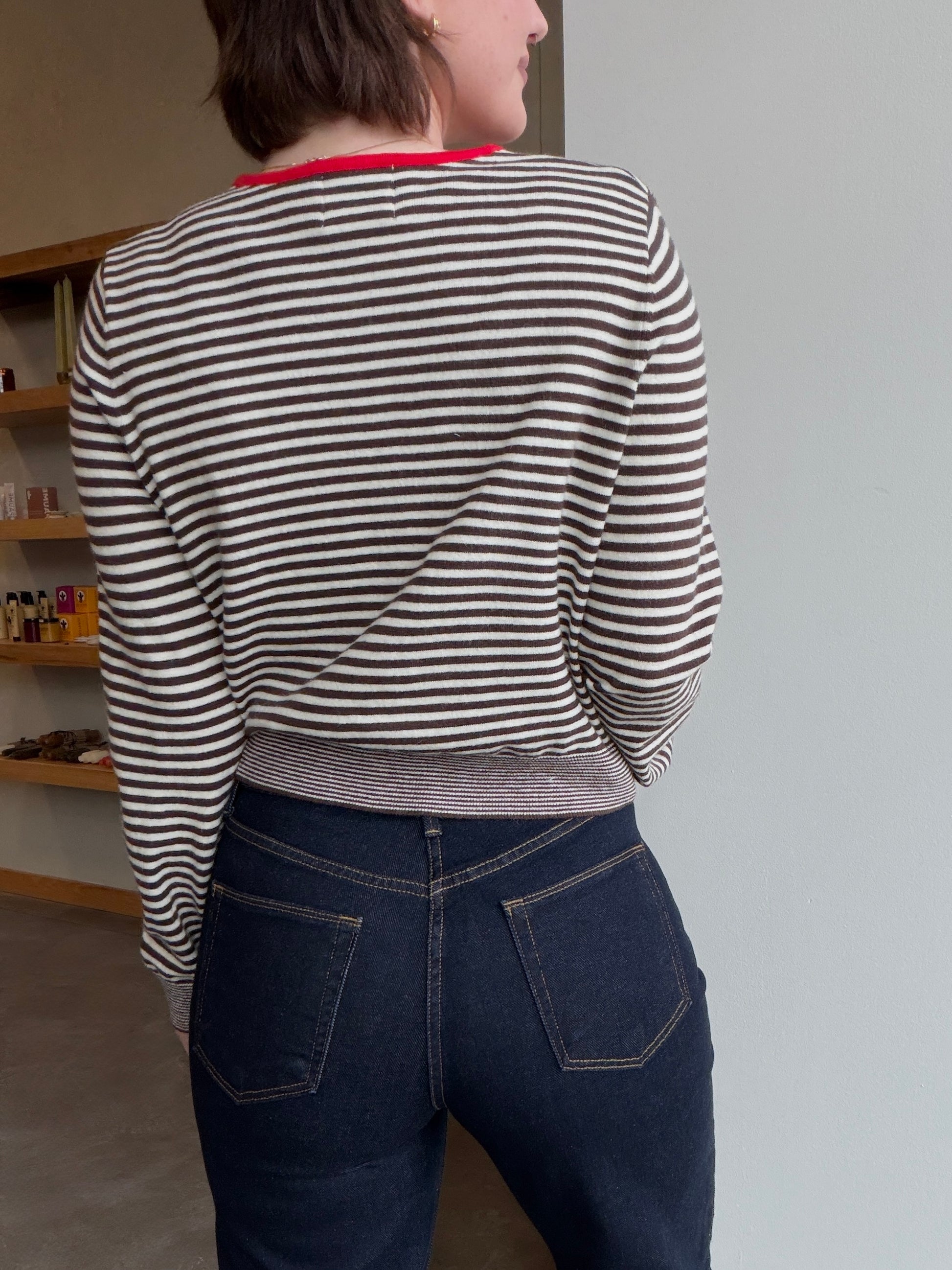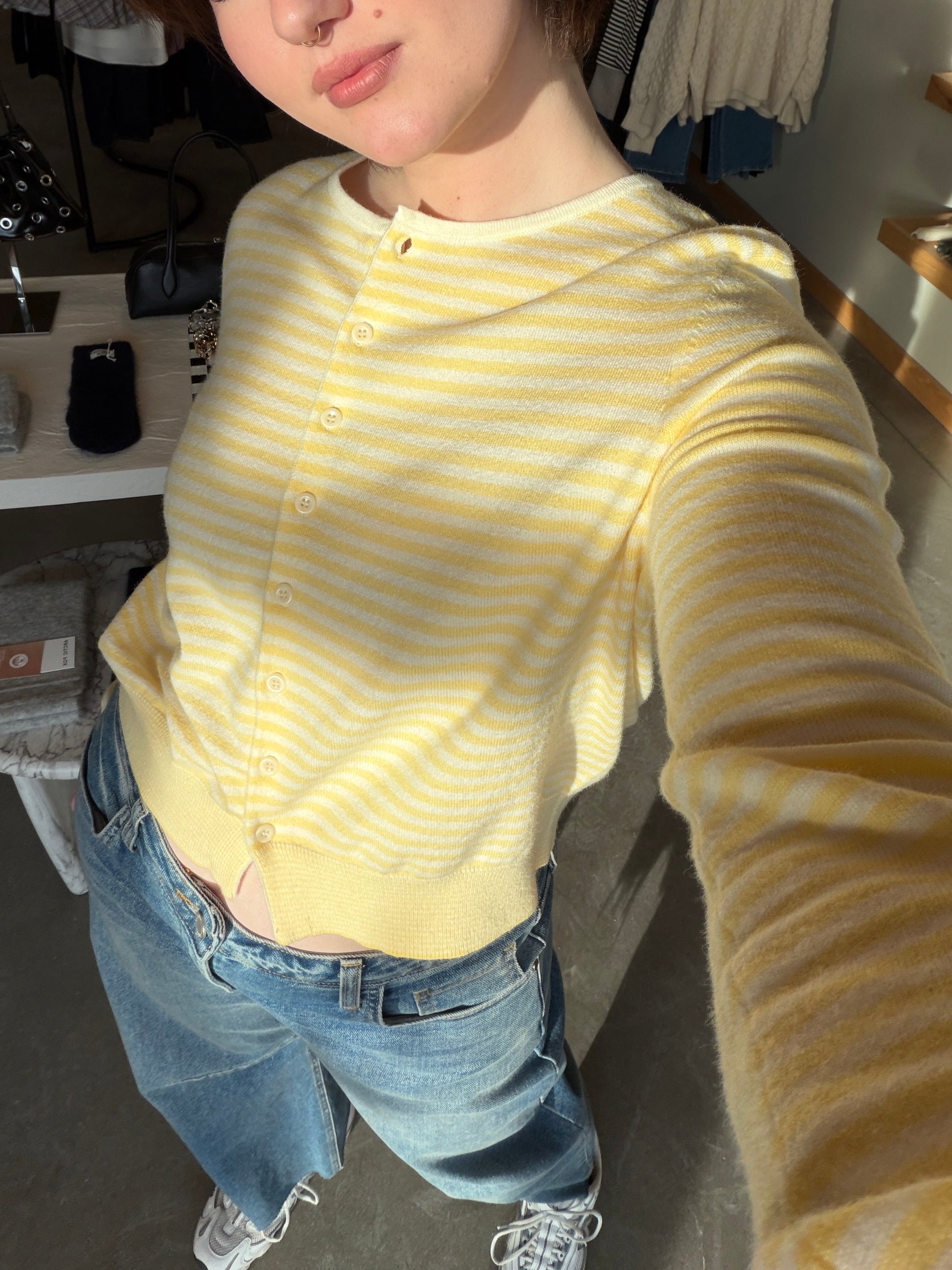 A striped lightweight, long-sleeve stripe knit cardigan. A relaxed fit, button-down closure, and a subtle front bottom slit.