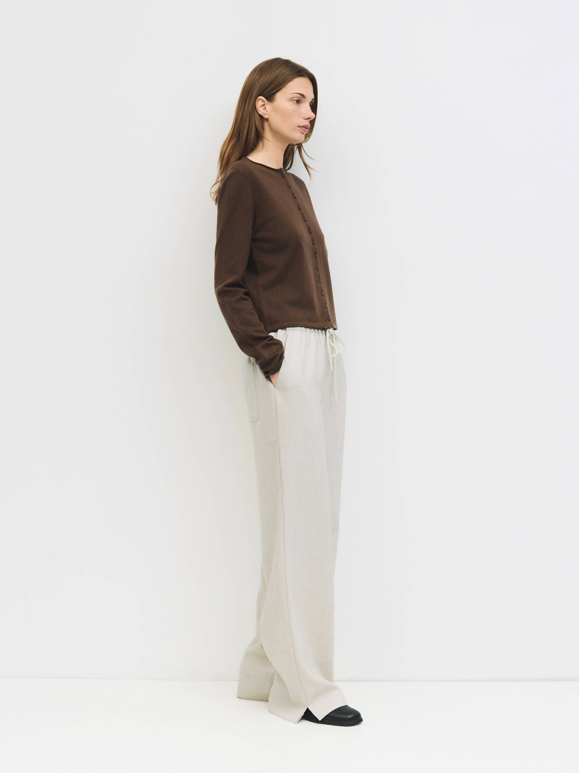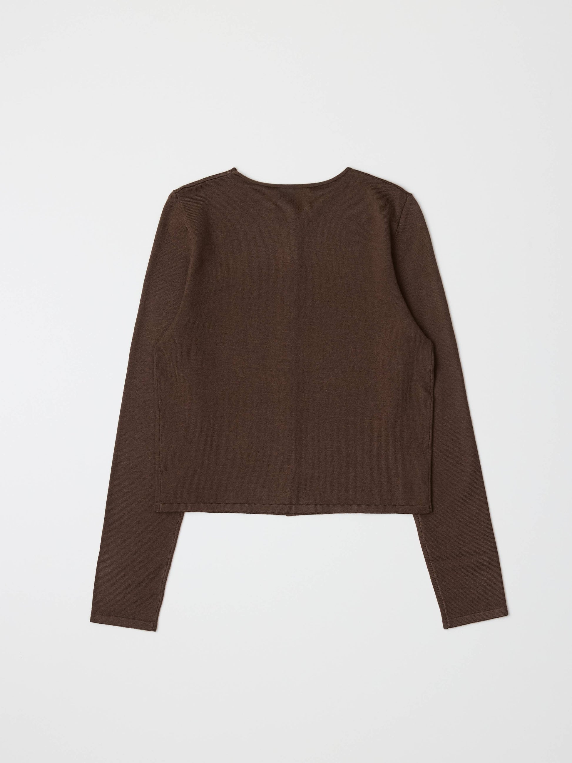 Features a cozy rolled neckline and long sleeves for a refined, comfortable look. The front button closure and midweight knit fabric make it a versatile piece, perfect for layering or wearing on its own.